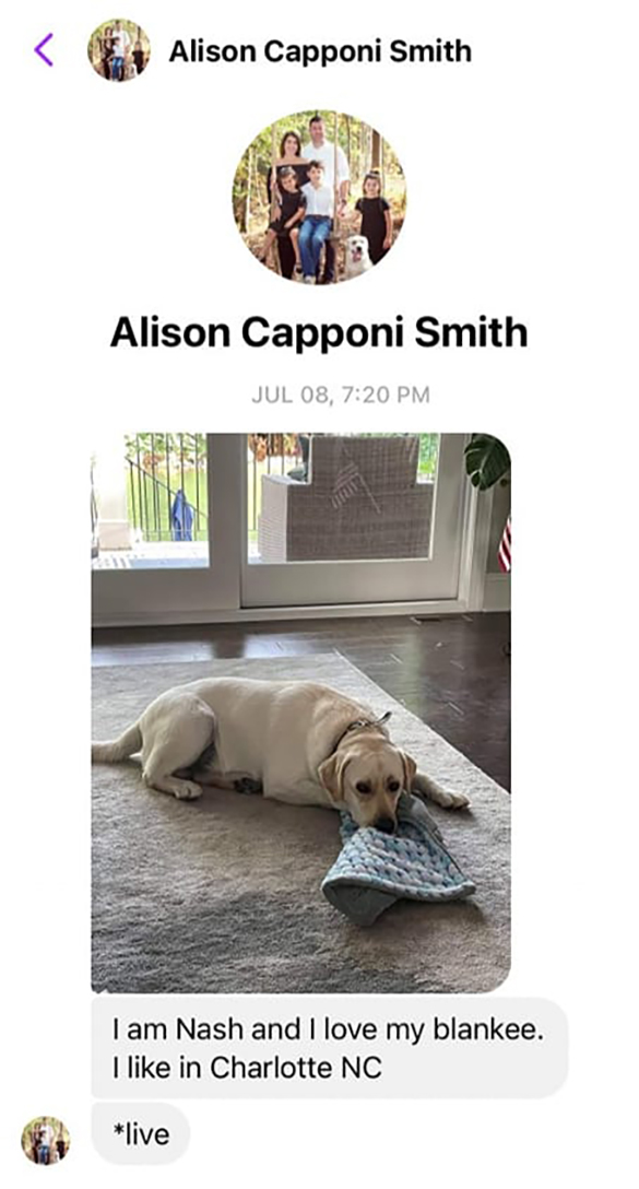 "Hello! I was visiting Charleston over the past weekend and bought a few of your amazing blankets for my fur babies! So here it is, she loves! If our other pup slows down long enough to lay on his I'll be sure to send along a picture of him. Thank you for such an amazing product!