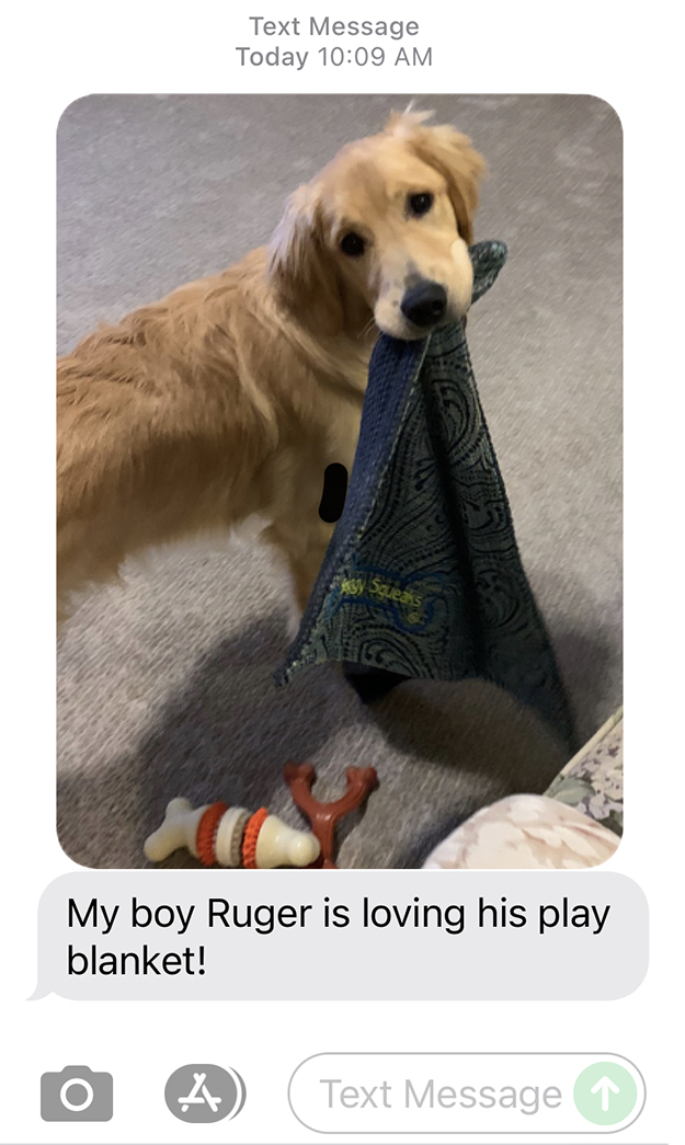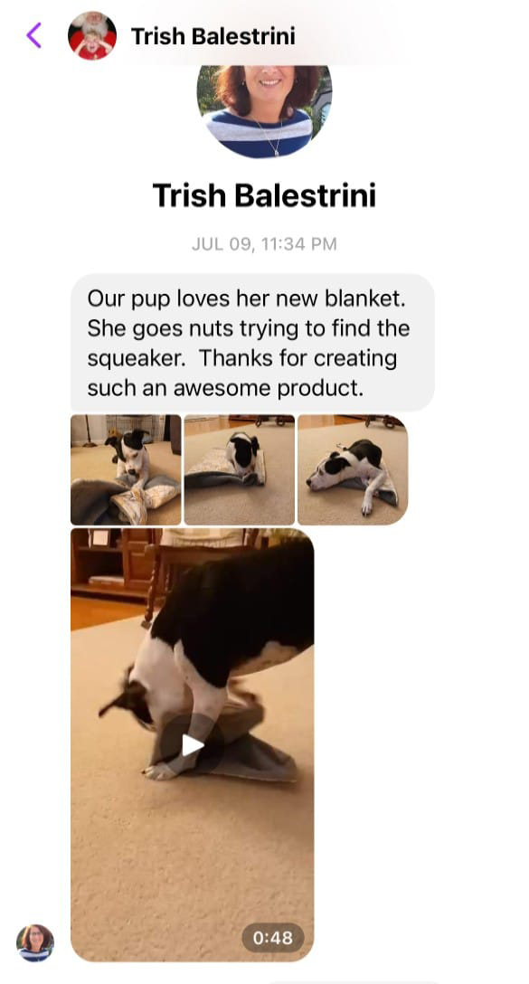 "Our pup loves her new blanket. She goes nuts trying to find the squeaker. Thanks for creating such an awesome product!"